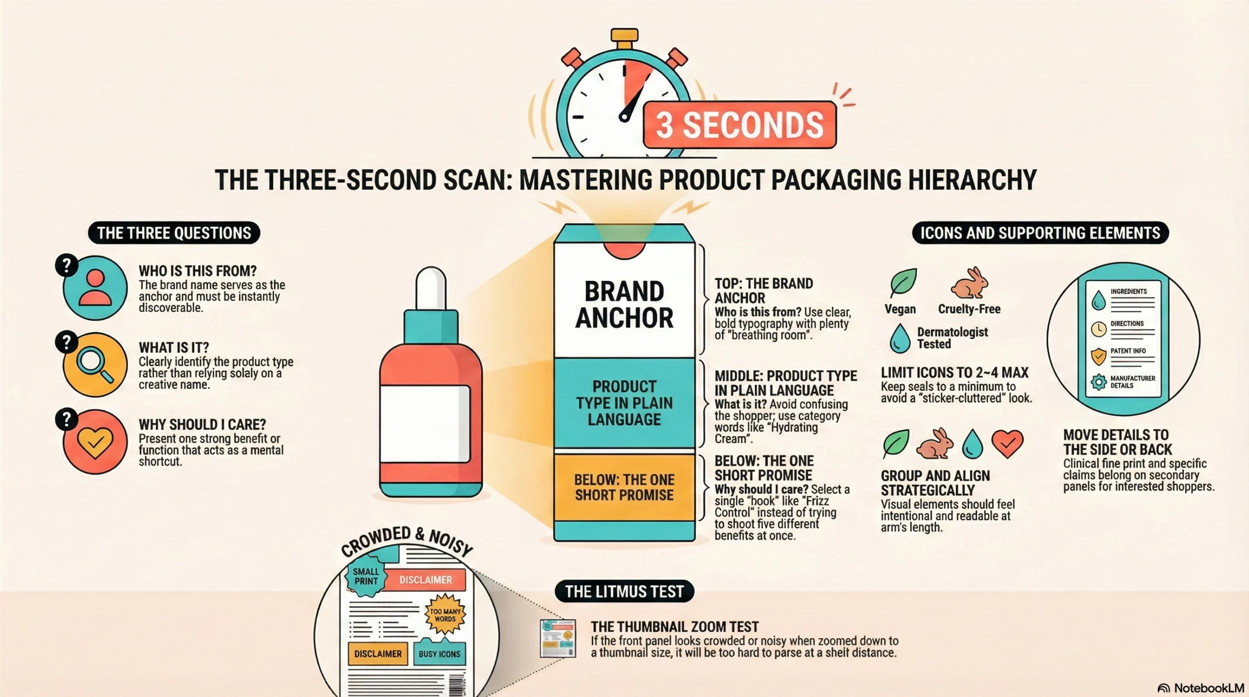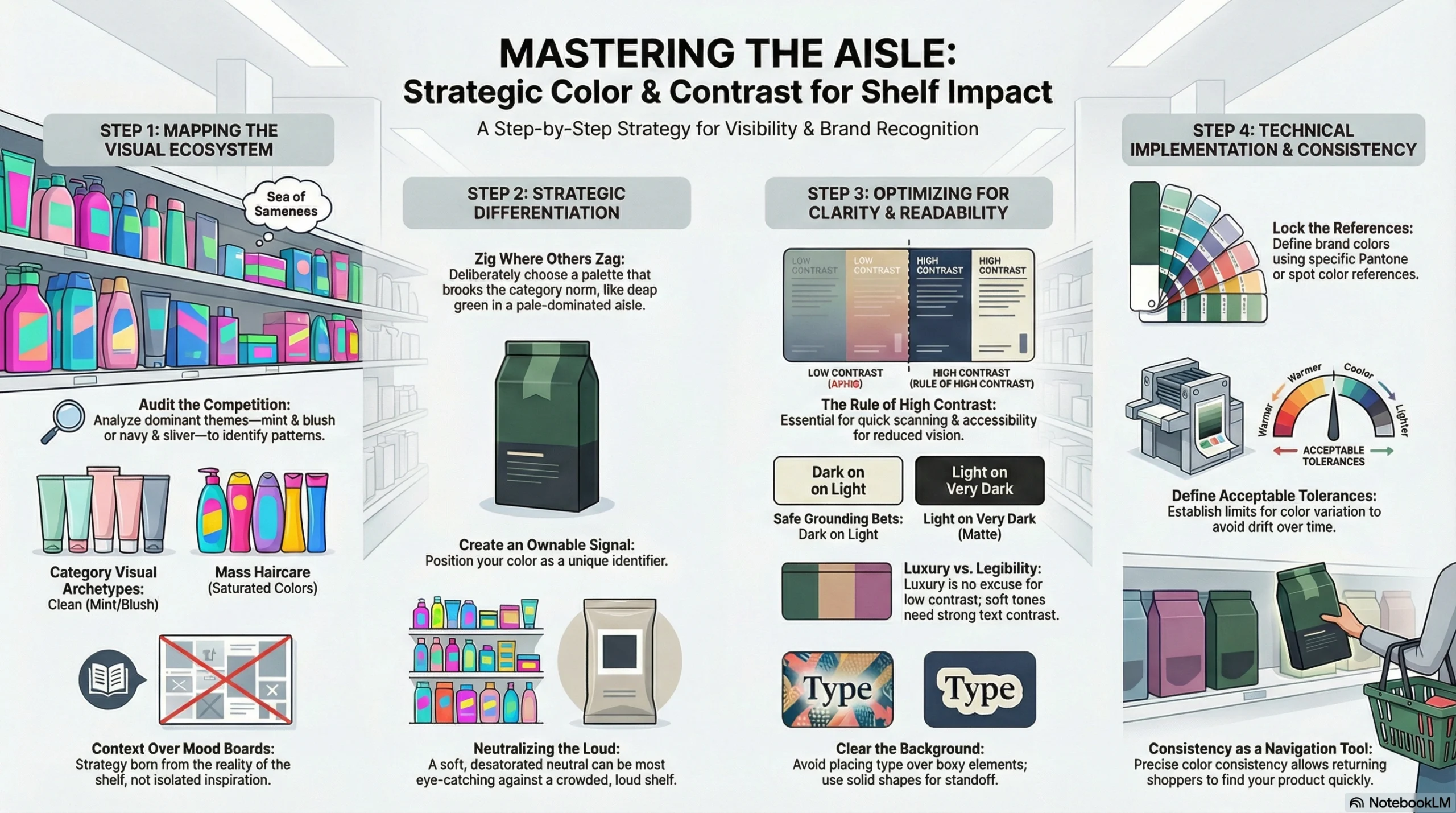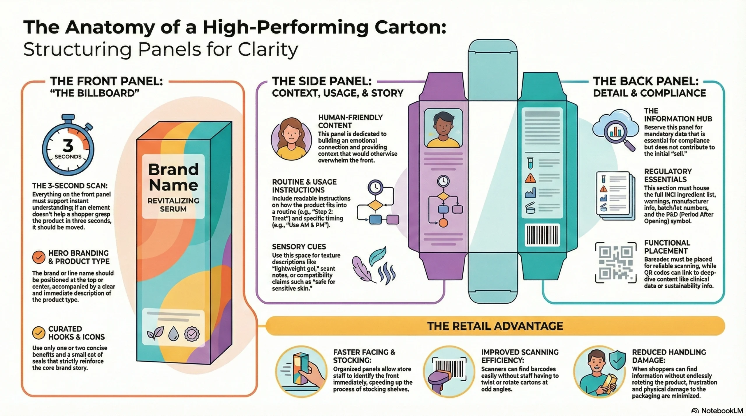 • Design for clarity: Use billboard-style hierarchy on the front panel, color that differentiates on shelf, and logical panel layouts so shoppers understand instantly.