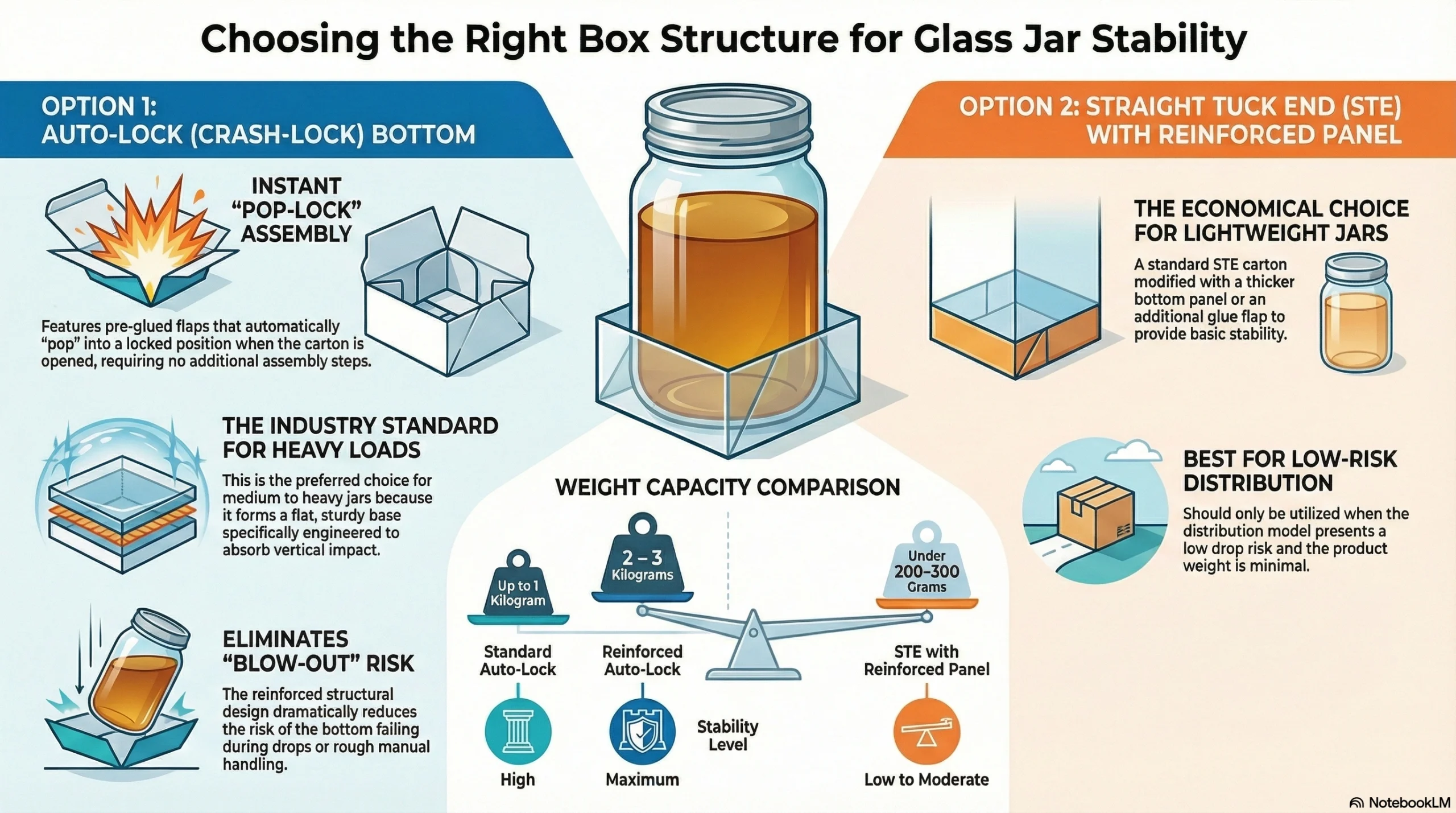 • Straight tuck end with reinforced bottom panel: For lighter jars (under 200–300 grams), a standard STE carton with a slightly thicker bottom panel or additional glue flap can work. This is more economical than auto‑lock but should only be used when the product weight and distribution model don’t create high drop risk.