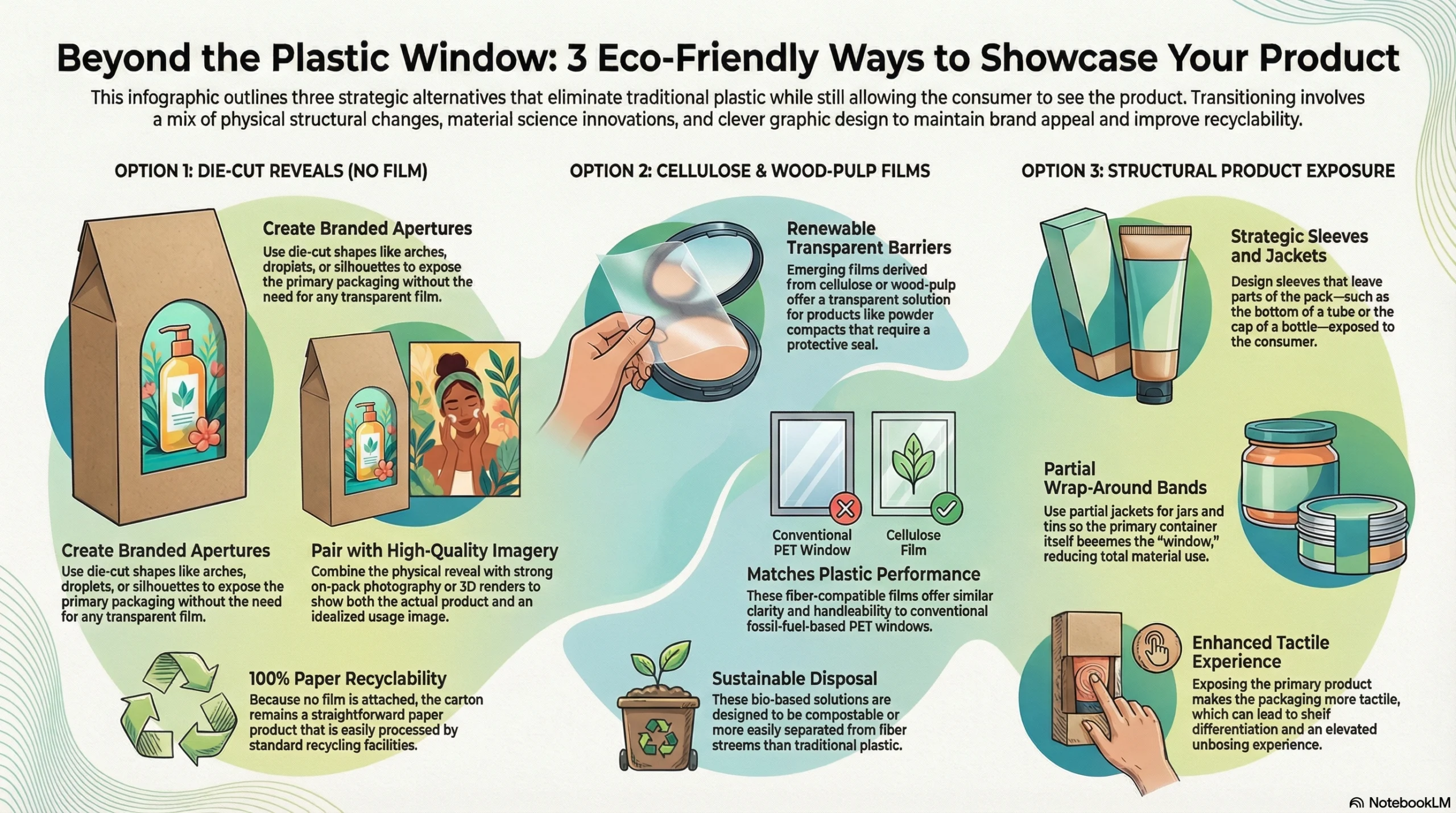 Yes—through bio-based window alternatives or structural solutions. Seaweed-based films (like Sway x EcoEnclose) are 100% biobased, compostable, and curbside recyclable while still providing product visibility. Alternatively, use die-cut reveals with no film at all, paired with strong on-pack photography, or design sleeve structures that partially expose the primary packaging. Cellulose-based films also offer transparency while remaining fiber-compatible in recycling streams, keeping your carton mono-material and genuinely sustainable.