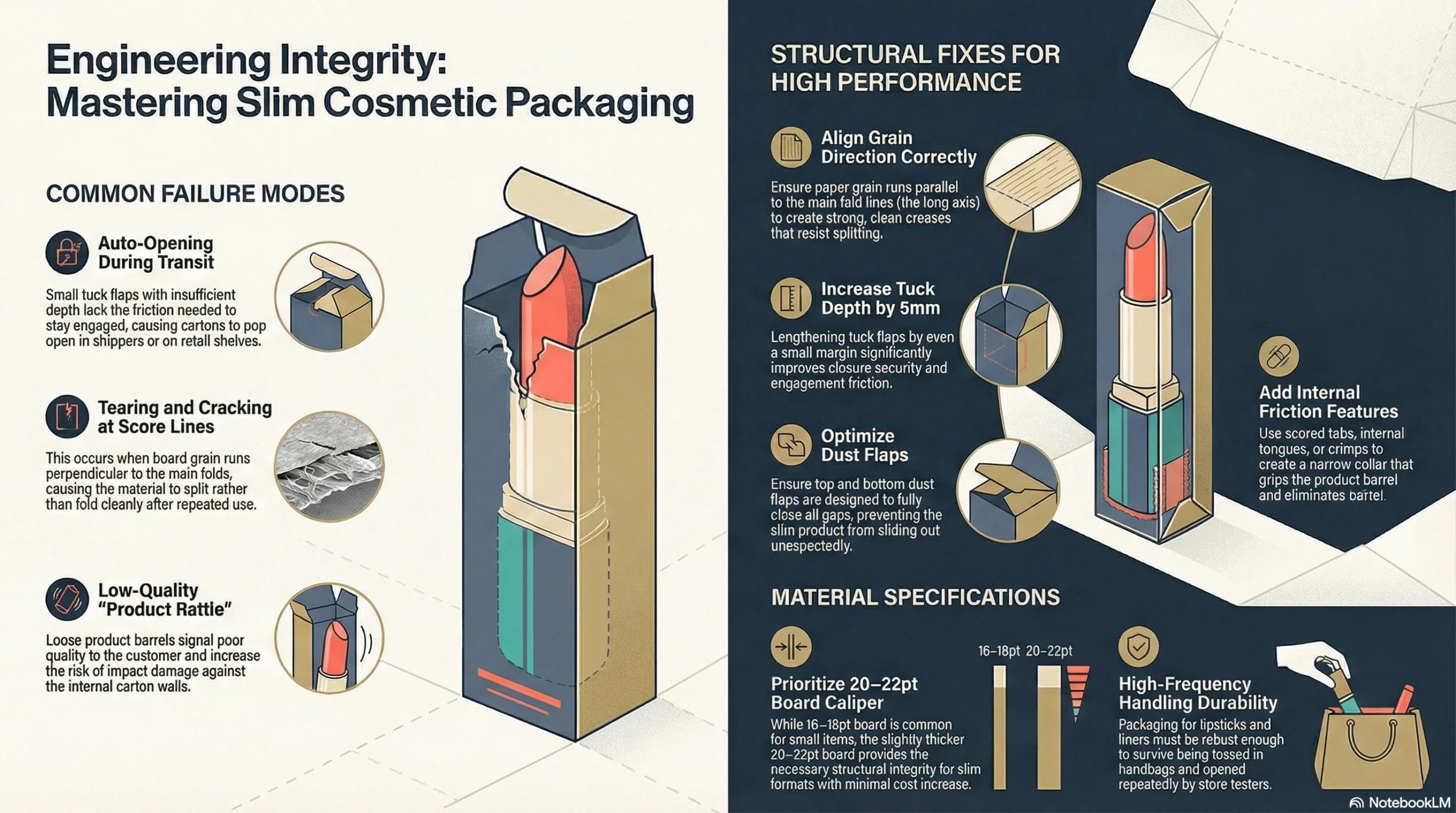 • Match structure to format: Tubes, jars, droppers, pumps, and slim sticks each need specific carton styles and inserts to prevent damage and eliminate rattle.