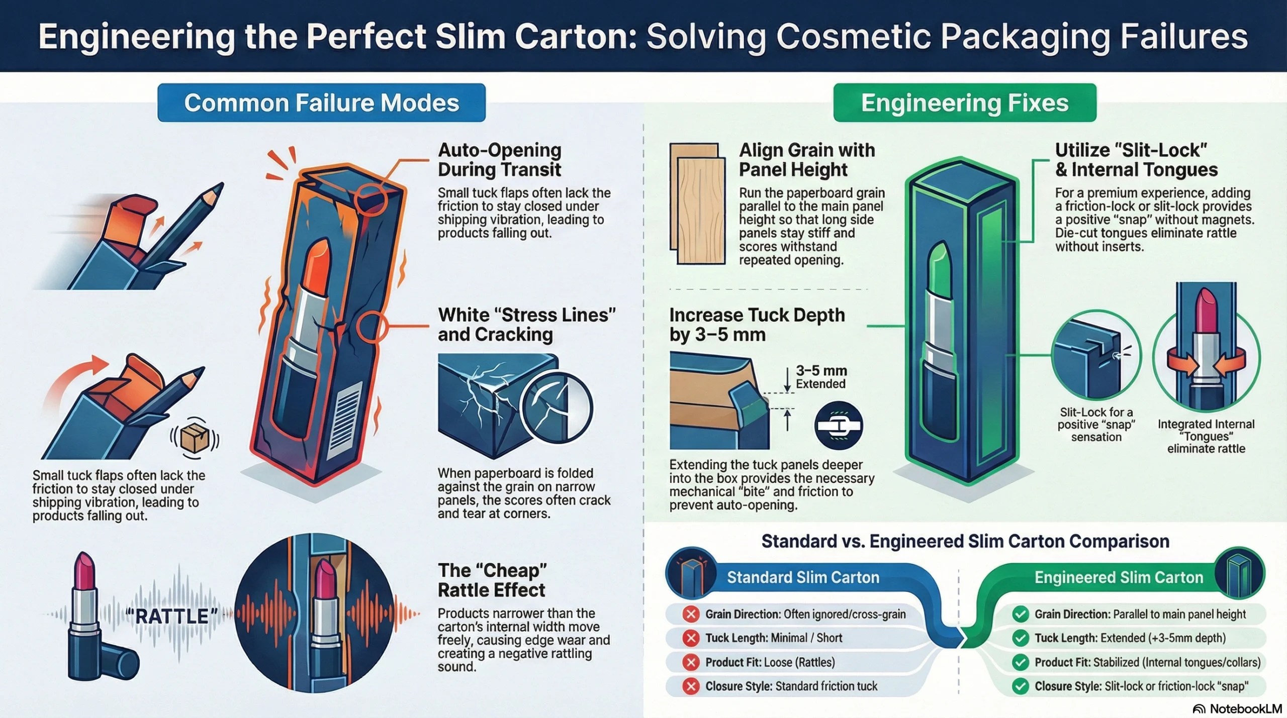 Slim cartons fail when grain direction is wrong (causing scores to crack), tuck flaps are too short (insufficient engagement), or products rattle inside. Fix these by: specifying grain parallel to the main panel height so scores fold cleanly, increasing tuck depth by 3-5mm for better closure security, and adding simple internal paperboard tongues or collars that lightly grip the product barrel to eliminate movement. These small tweaks dramatically improve structural integrity without major cost increases.