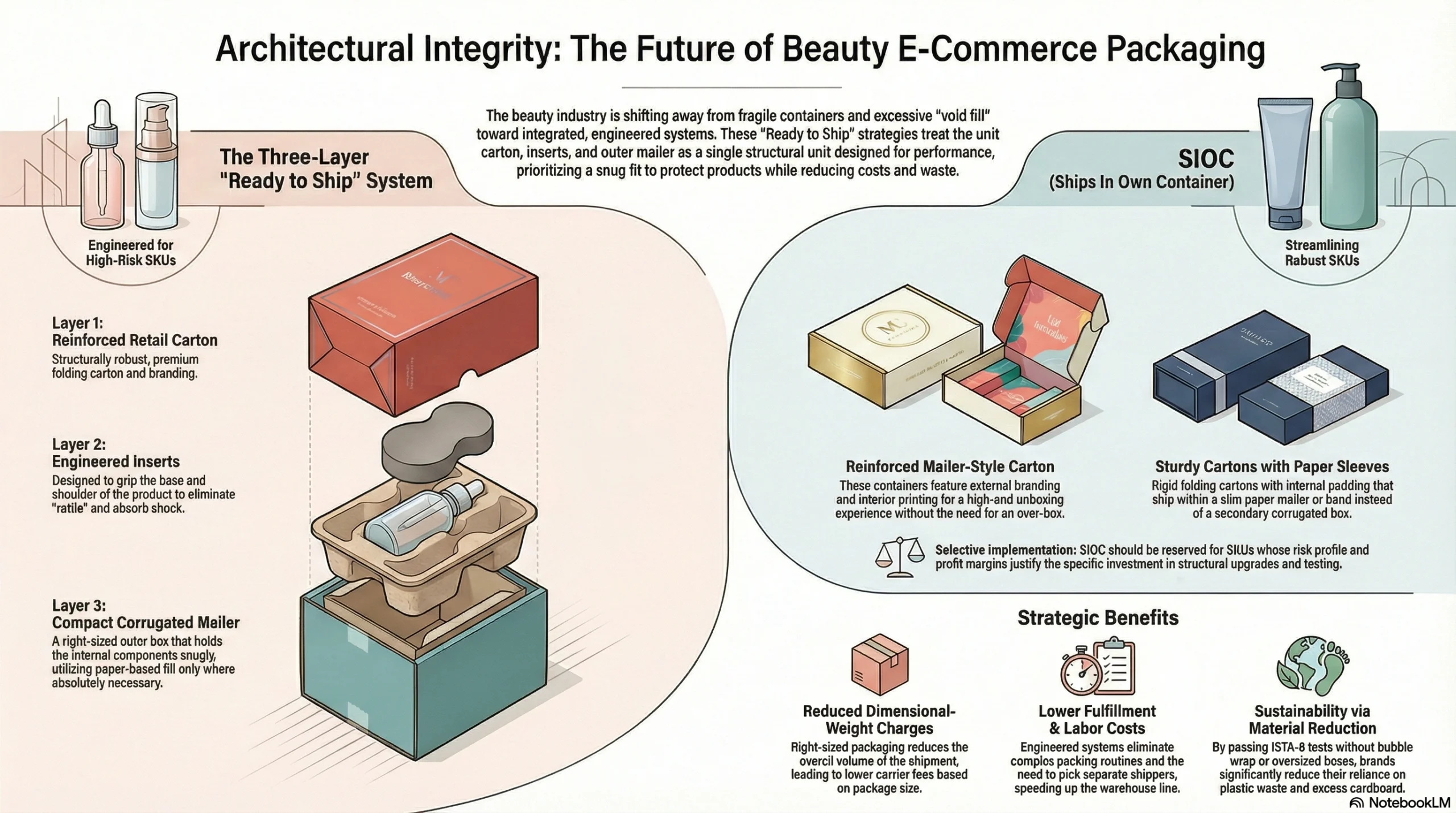 Perform across channels. The same SKU might need to stand perfectly upright on a Sephora shelf and survive automated fulfillment, conveyor-belt sorting, and a 4-foot drop onto concrete during last-mile delivery. Retail-only thinking or DTC-only thinking both create expensive problems.