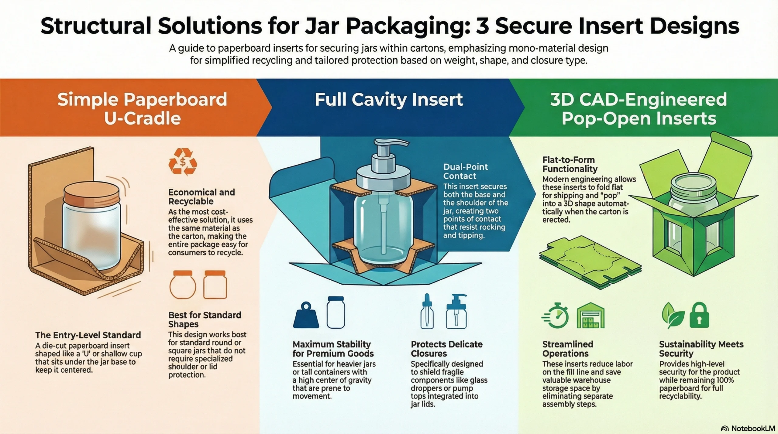• 3D CAD‑engineered pop‑open inserts: Modern carton engineering can design inserts that fold flat during shipping and “pop” into their final 3D shape when the carton is erected, without requiring separate assembly steps. These reduce labour on the fill line, save storage space, and can be designed to cradle jars securely while remaining fully paperboard for recyclability.