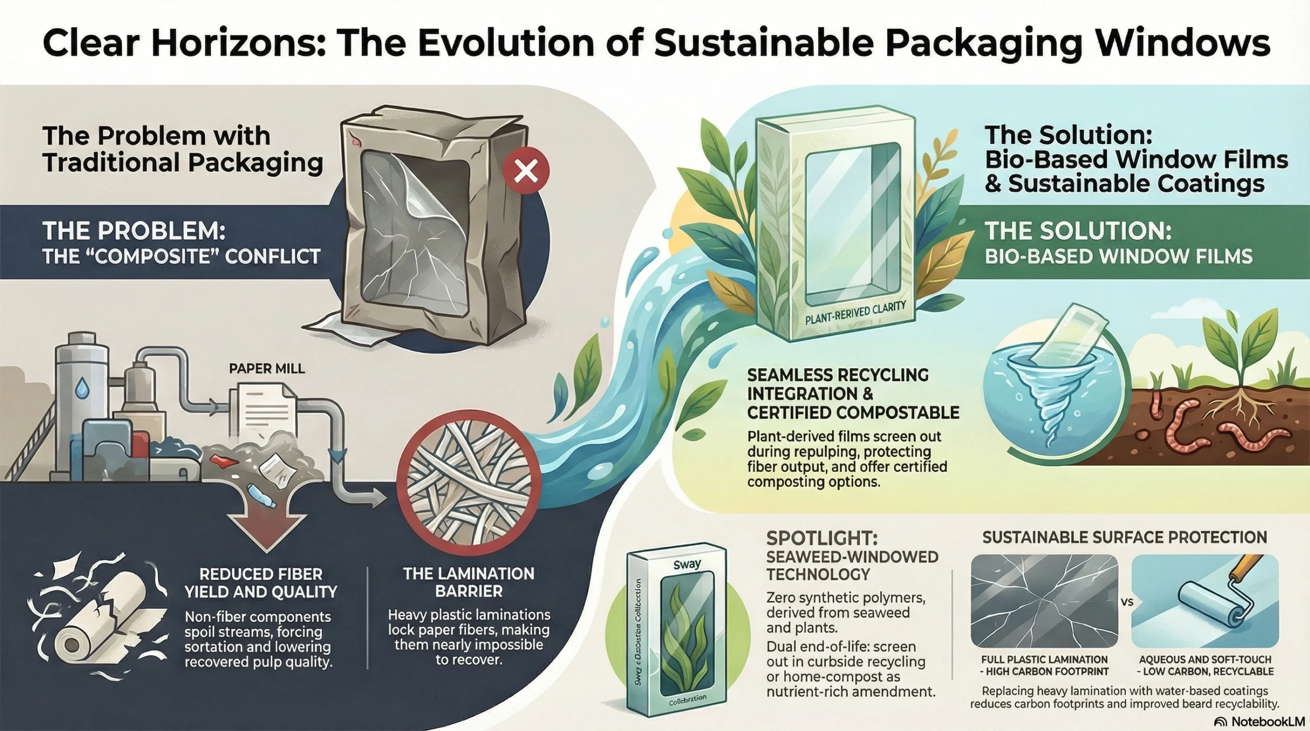 A standout example is the Sway x EcoEnclose seaweed‑windowed retail box. This collaboration replaces fossil‑based plastic film with a seaweed‑based window that is certified 100% biobased and home and industrial compostable, while the box itself uses 100% recycled paperboard. According to EcoEnclose and Sway: