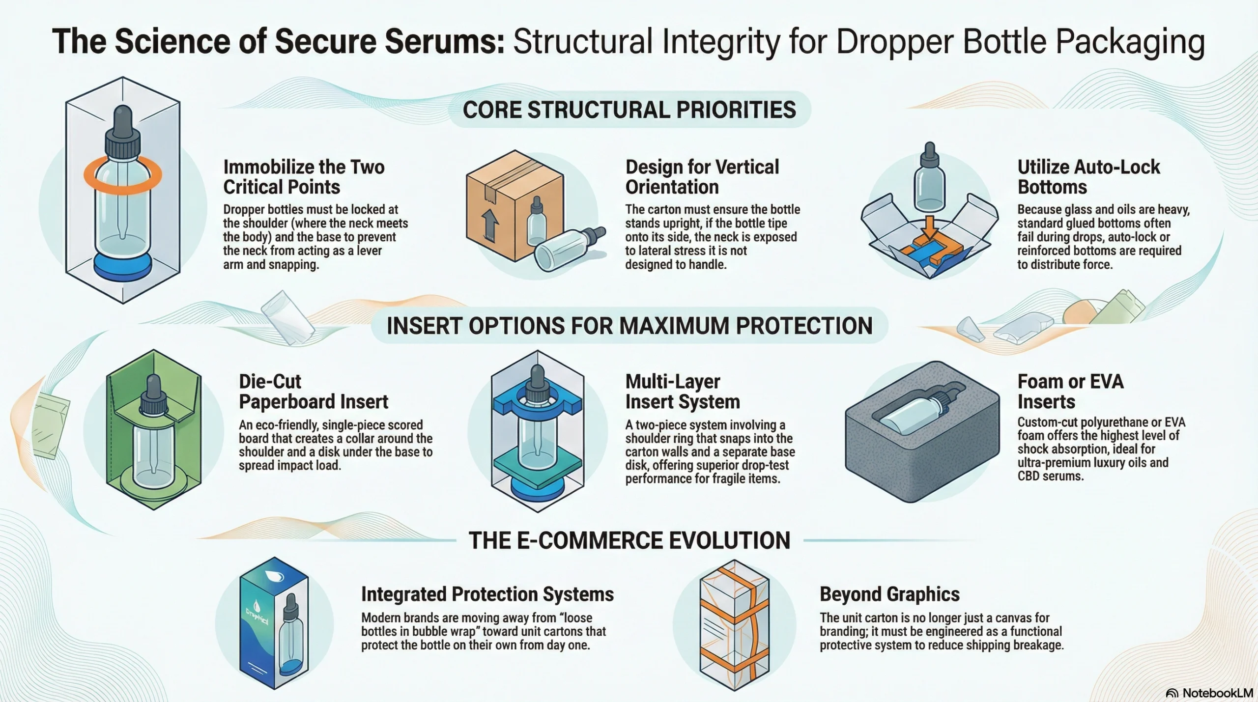Glass dropper bottles need auto-lock bottom cartons for weight-bearing strength, combined with inserts that immobilize the bottle at two critical points: the shoulder (to prevent neck snapping) and the base. Use die-cut paperboard inserts that create a collar around the shoulder plus a disk or cup under the base, or consider EVA foam inserts for ultra-premium lines. The key is keeping the bottle upright and preventing any rocking or tipping that could stress the fragile neck during drops.