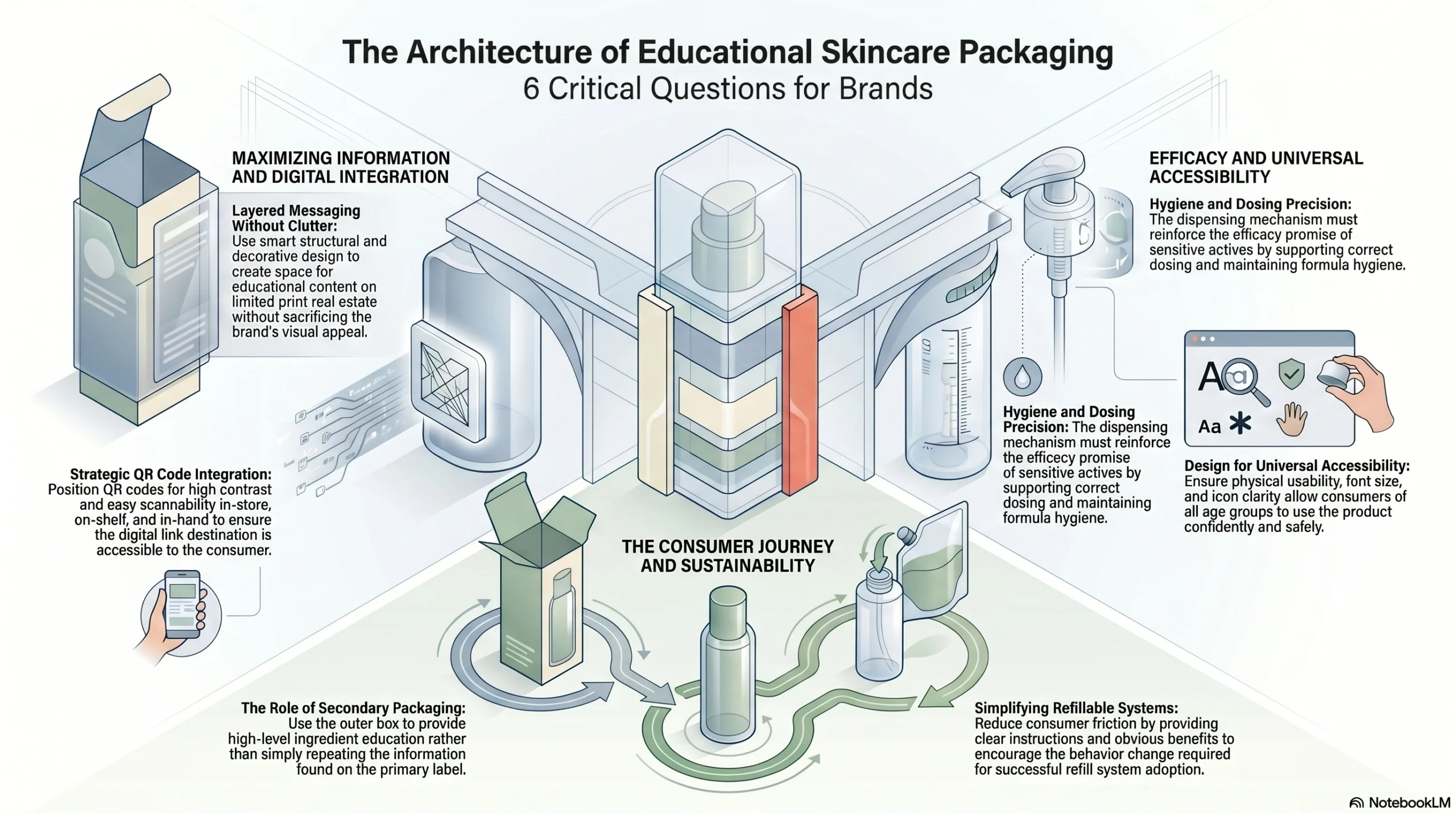 That means plain-language labeling. Thoughtful visual hierarchy. QR codes that open into genuinely useful content. Format choices — airless systems, opaque containers, controlled-dose dispensers — that are explained honestly and match the formula’s needs. Secondary packaging that teaches before the consumer even opens the primary container. And accessibility standards that include every consumer, not just the most digitally fluent.