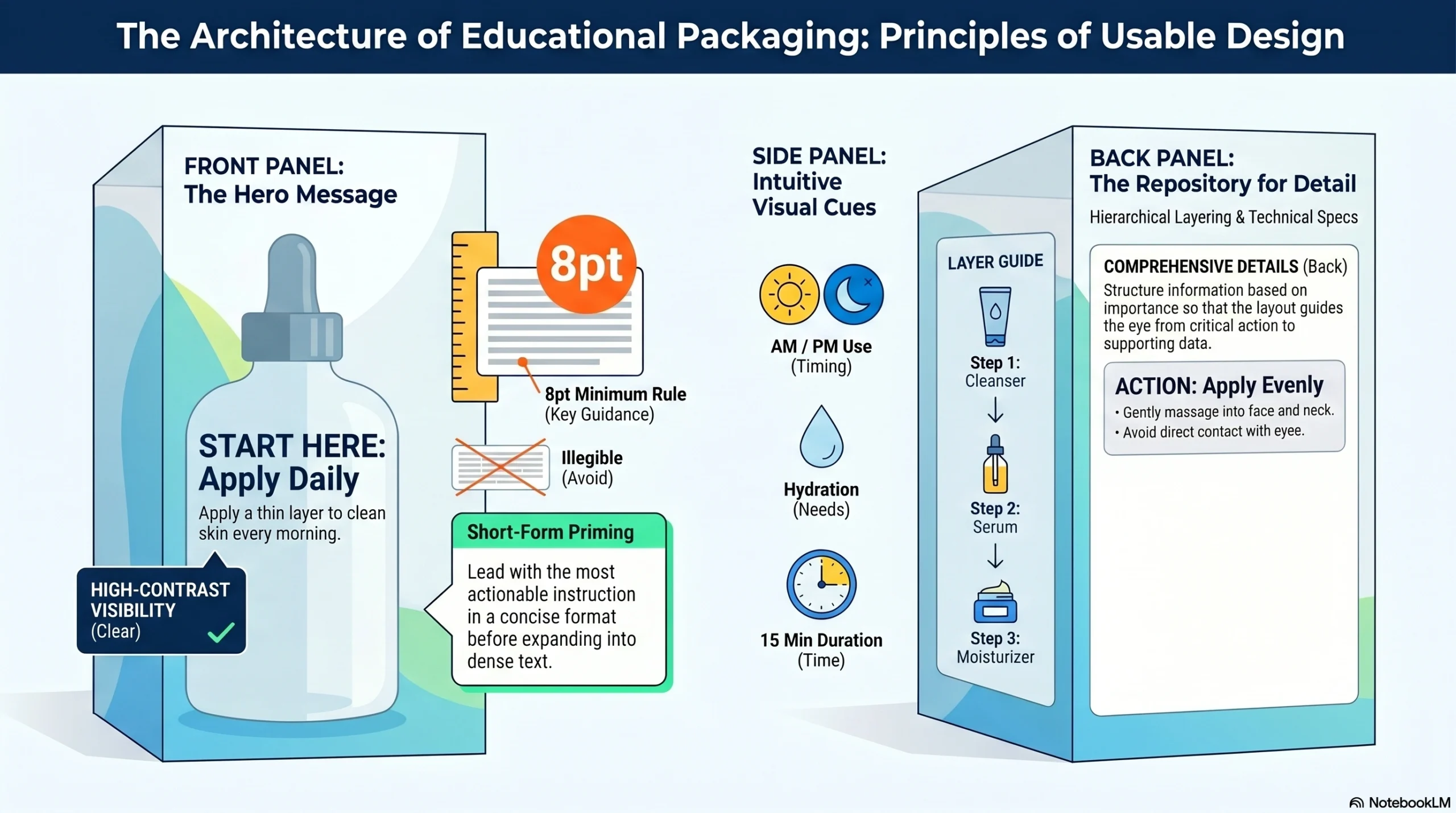 Brands with product ranges — a cleanser, a serum, a moisturizer, a targeted treatment — can use consistent icon systems, color-coding, or numbered sequencing across the line to help consumers understand the full routine at a glance.