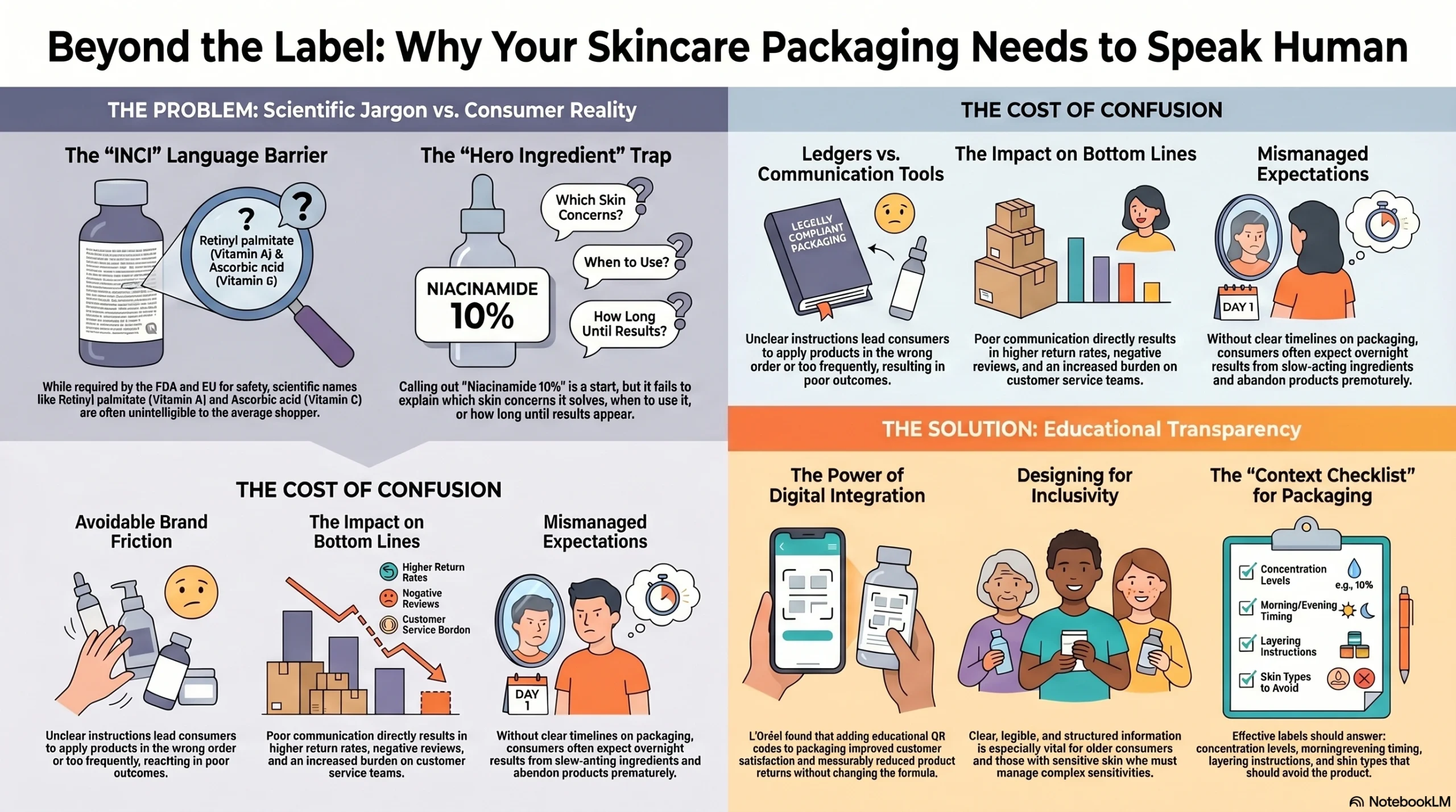 The problem is that most skincare packaging hasn’t kept pace. Labels still default to INCI lists, vague “with niacinamide” callouts, and dense back-panel text that assumes scientific fluency the average consumer simply doesn’t have. That gap between what consumers need to know and what packaging actually tells them creates confusion, erodes trust, and, in many cases, causes products to underperform — not because the formula fails, but because the user didn’t know how to apply it correctly.