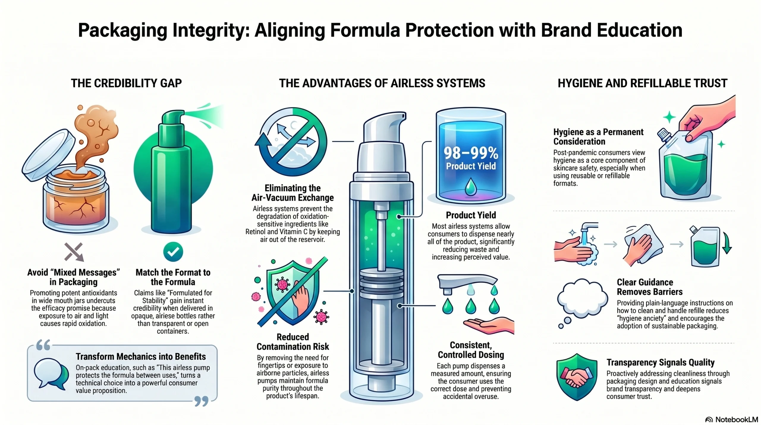 Every structural or material choice in skincare packaging is an opportunity to communicate efficacy. Examples of format-as-education: