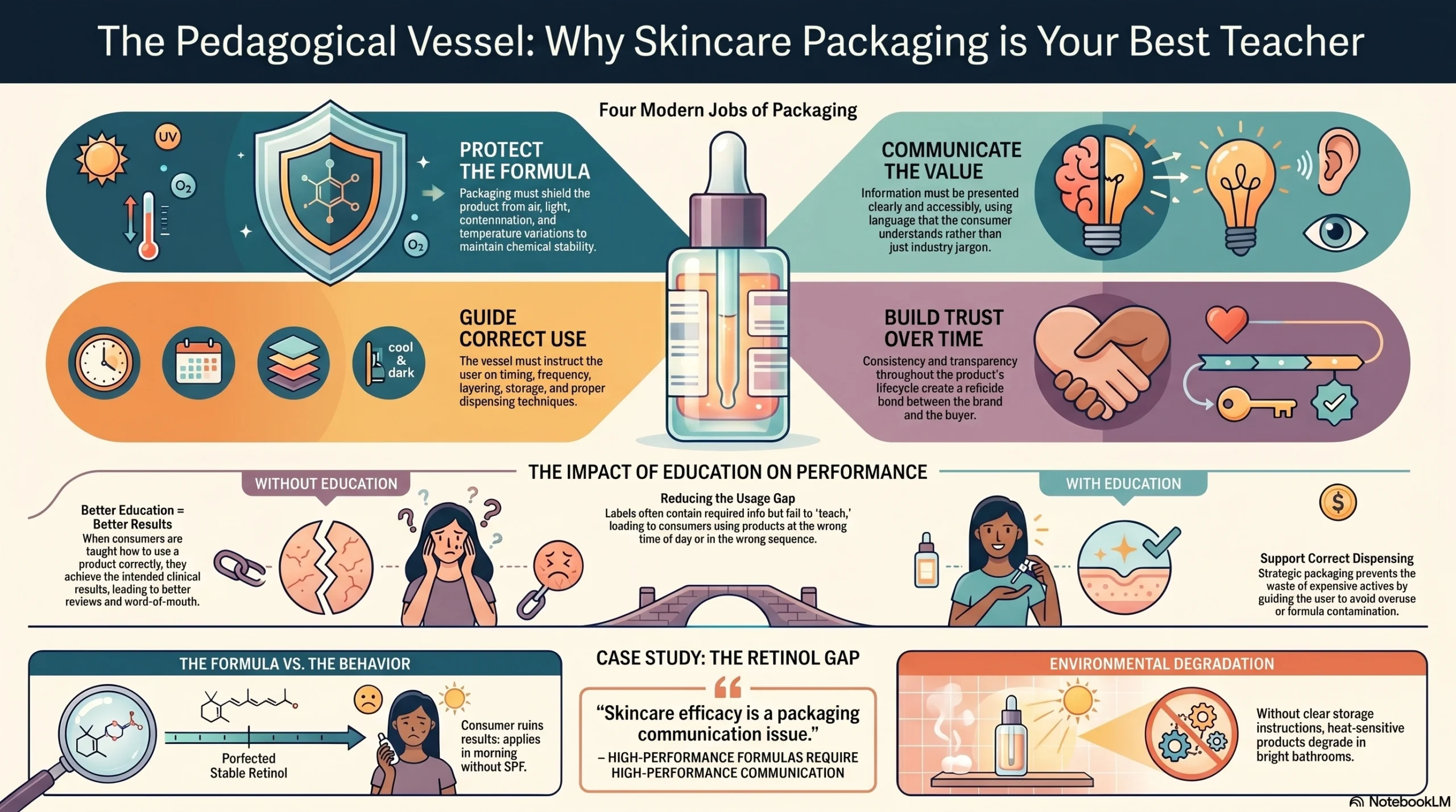 A brand can spend years perfecting a retinol formula — sourcing the most stable derivative, optimizing the delivery system, clinically testing the outcome — and then lose all of that investment because the consumer applied it every morning instead of every other evening, didn’t use SPF alongside it, or stored it on a bright bathroom shelf where heat and light degrade its potency.