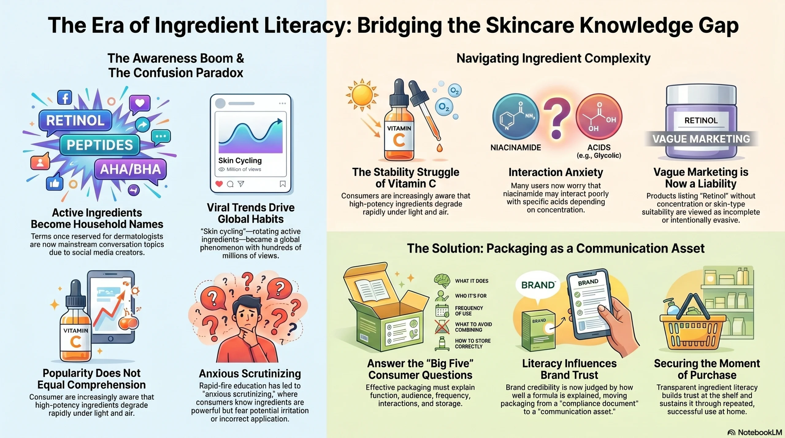 But popularity does not equal comprehension. When millions of consumers learn that retinol is powerful but also potentially irritating, that niacinamide is broadly tolerable but may interact poorly with certain acids at certain concentrations, or that vitamin C degrades when exposed to light and air — they develop a more anxious, more scrutinizing approach to what they buy and how they use it. Social media accelerated awareness; it also accelerated confusion. The result is a consumer who is highly motivated but frequently uncertain.